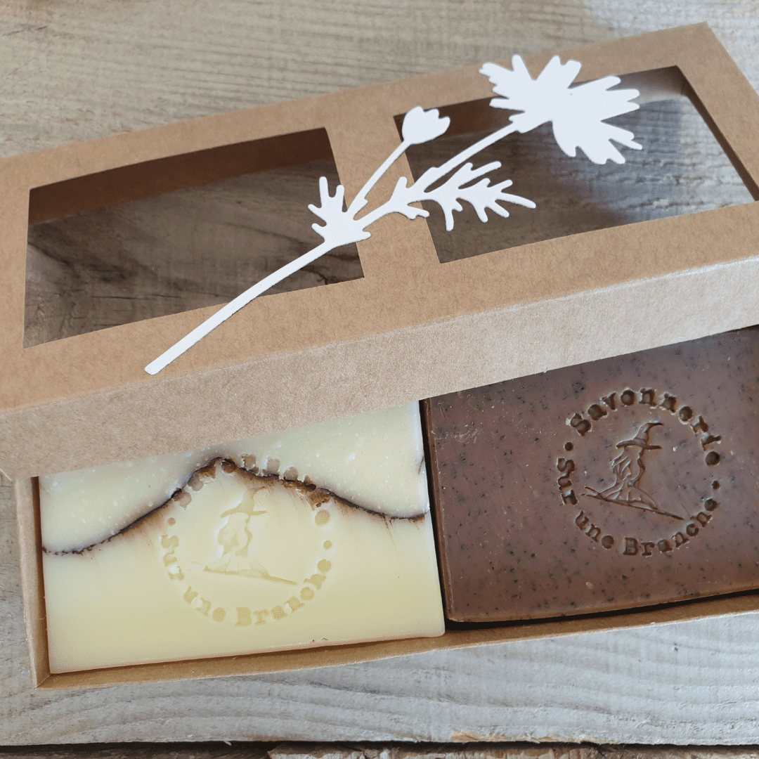 Coffret cadeau artisanal à composer avec 2 savons au choix. Fabrication à froid, ingrédients bio, pièce unique faite main. Un cadeau personnalisé et éthique.