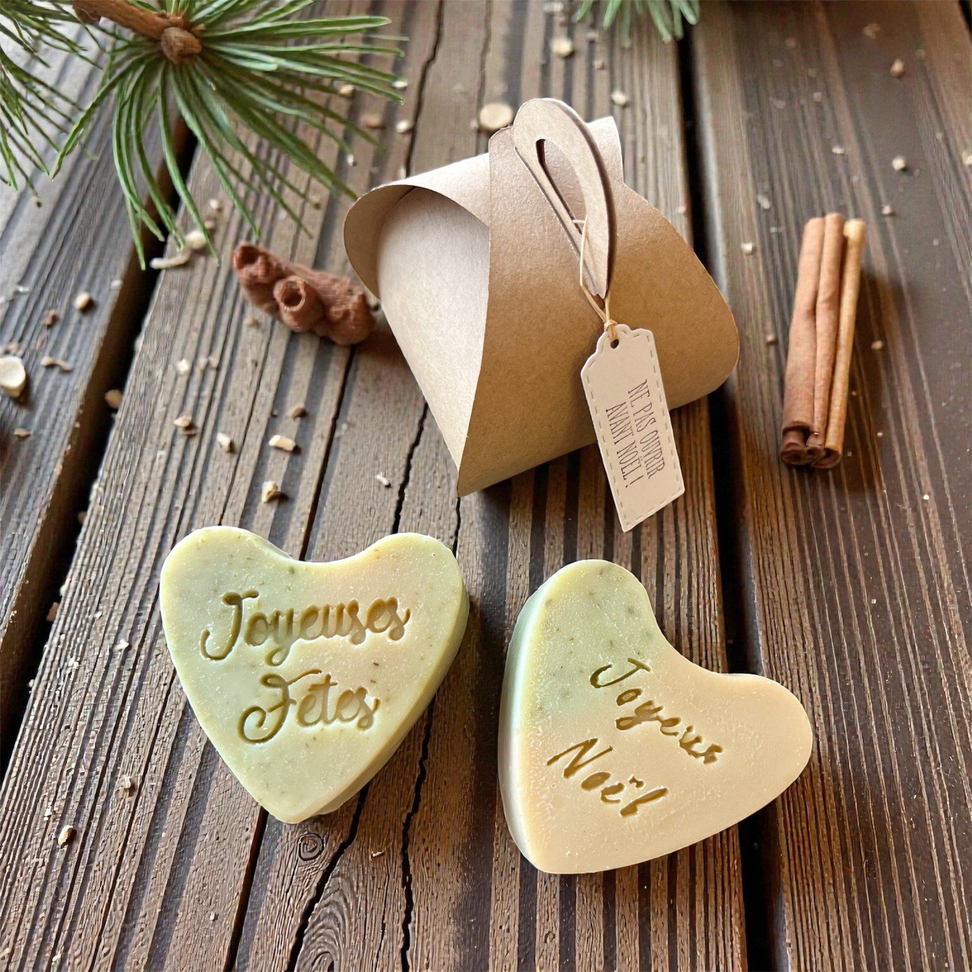 Un savon cœur parfumé comme une forêt enneigée, mêlant pin, cèdre et eucalyptus. Gravé “Joyeuses Fêtes” ou “Joyeux Noël”, présenté dans un ballotin kraft fait main. Un cadeau naturel, poétique et parfait pour les fêtes.